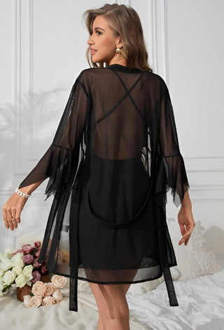 Elegant & Sheer Black Tulle Lingerie Set with Robe - R216