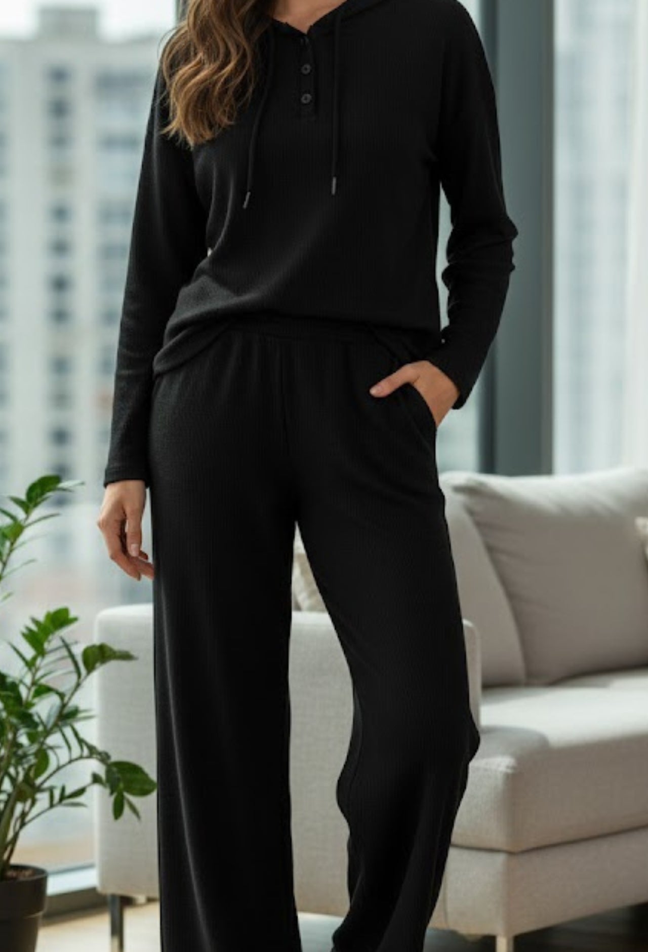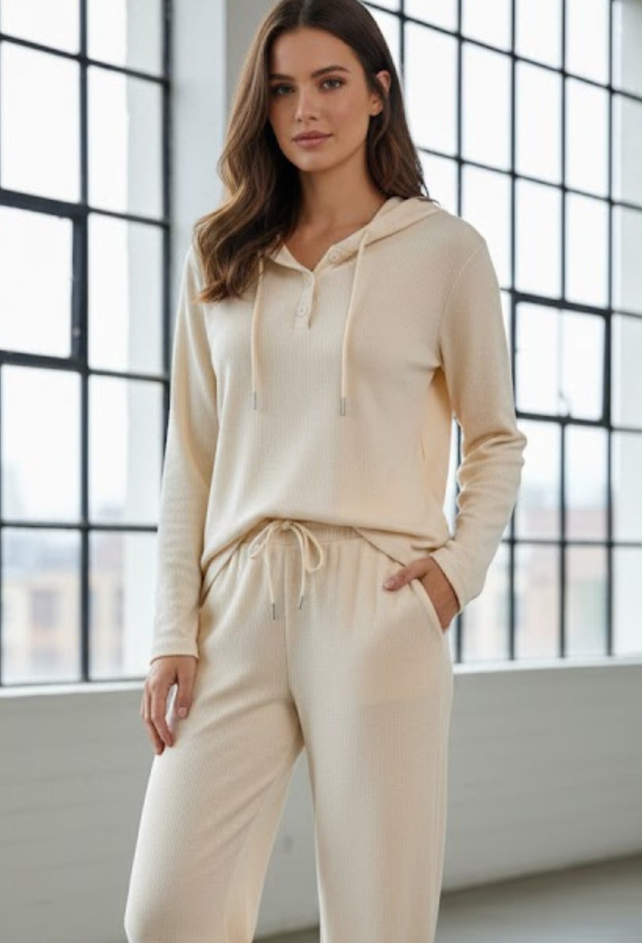 The distinctive fabric  offers a luxurious and comfortable feel. The jacket features a full zipper and front pockets , while the trousers are designed with a slightly wide, loose fit to provide absolute comfort and freedom of movement.