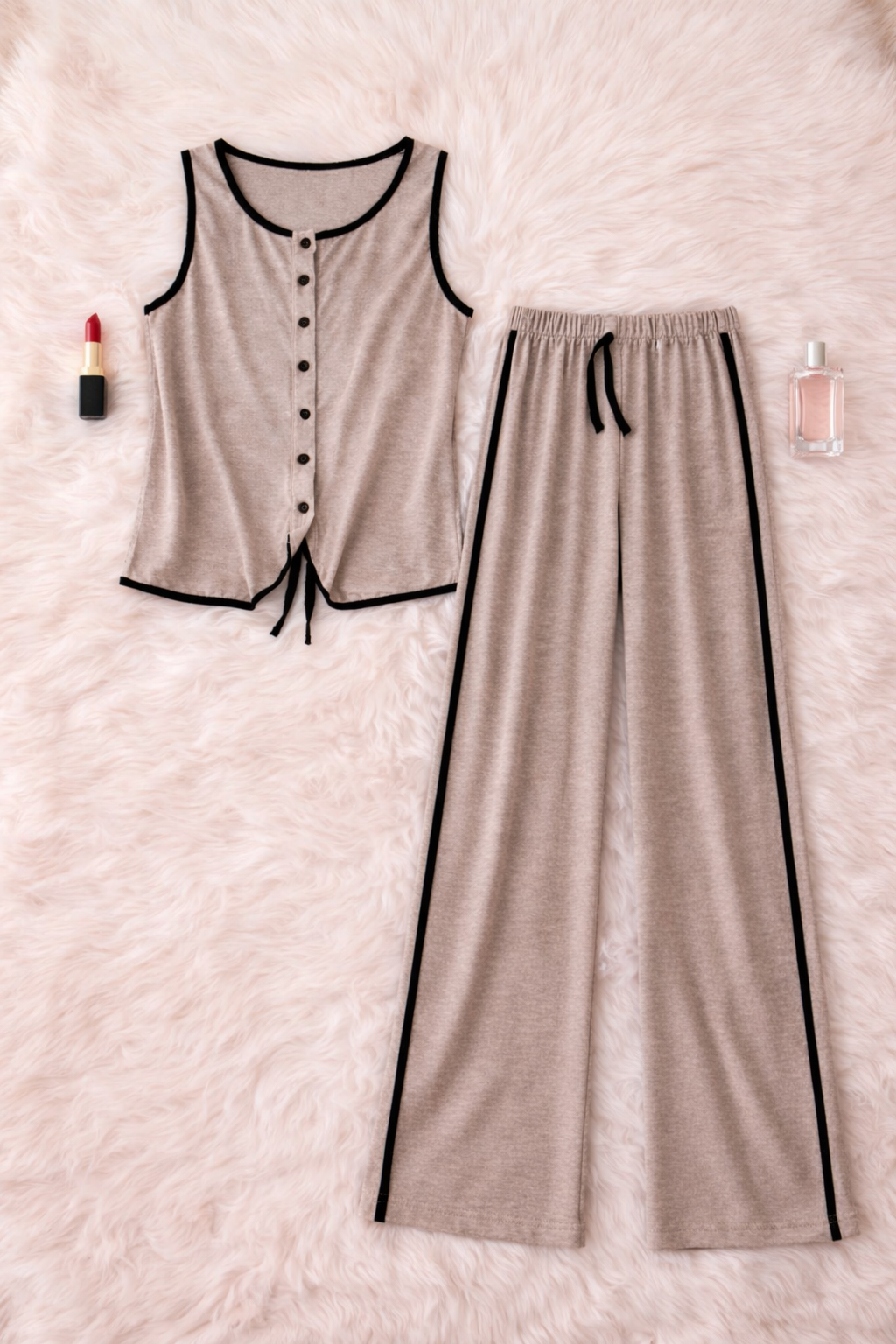Design: Two-piece set – Sleeveless button top – Wide-leg pants – Side stripe details