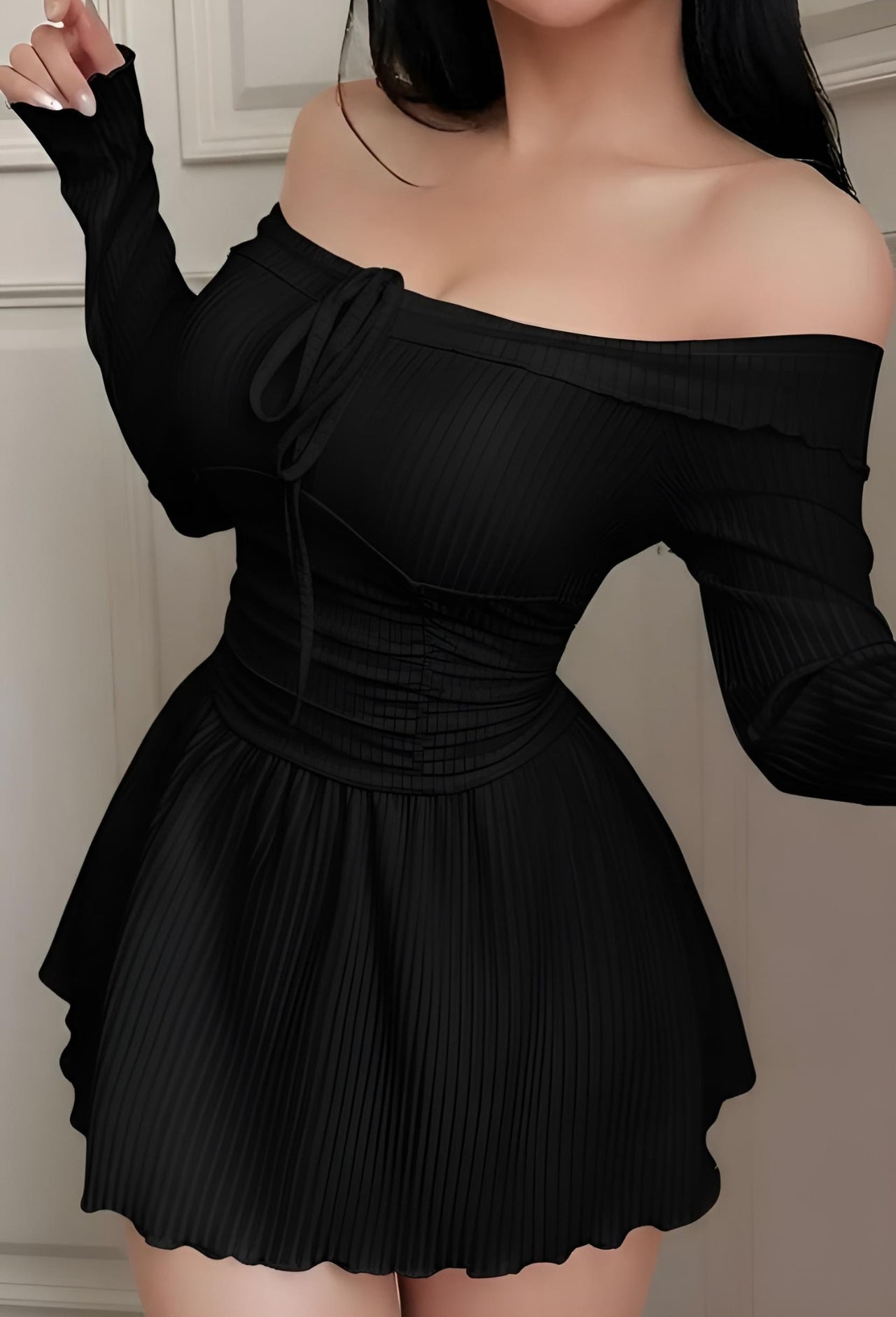 The off-shoulder dress reveals the shoulders. The sleeves are long and gathered at the hems. The waist is narrow and cinched with a front tie, highlighting the body's contours. Made of cotton and ribbed fabric. 60 % cotton, 40% polyester .The size of one is from 60 kg to 80 kg.