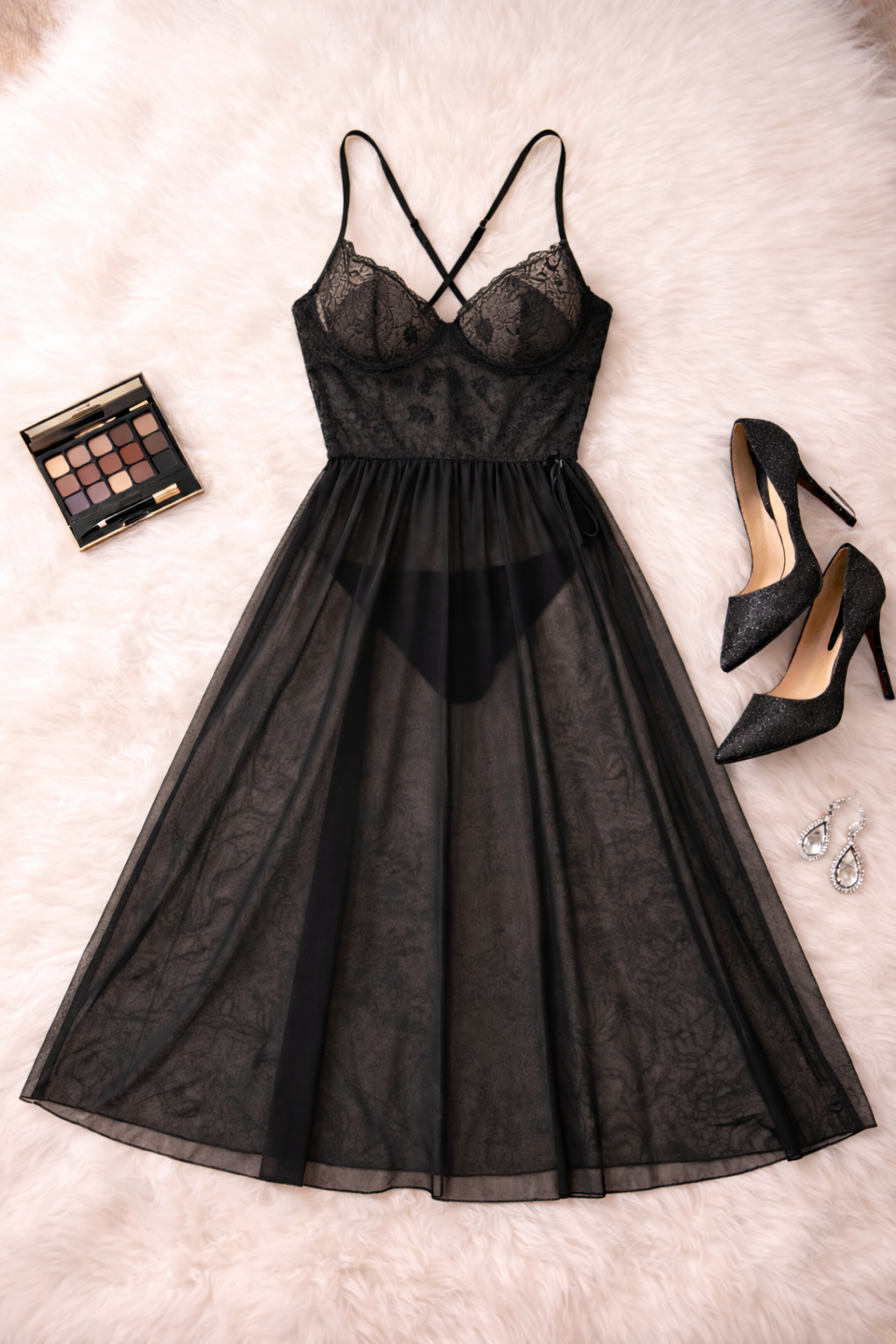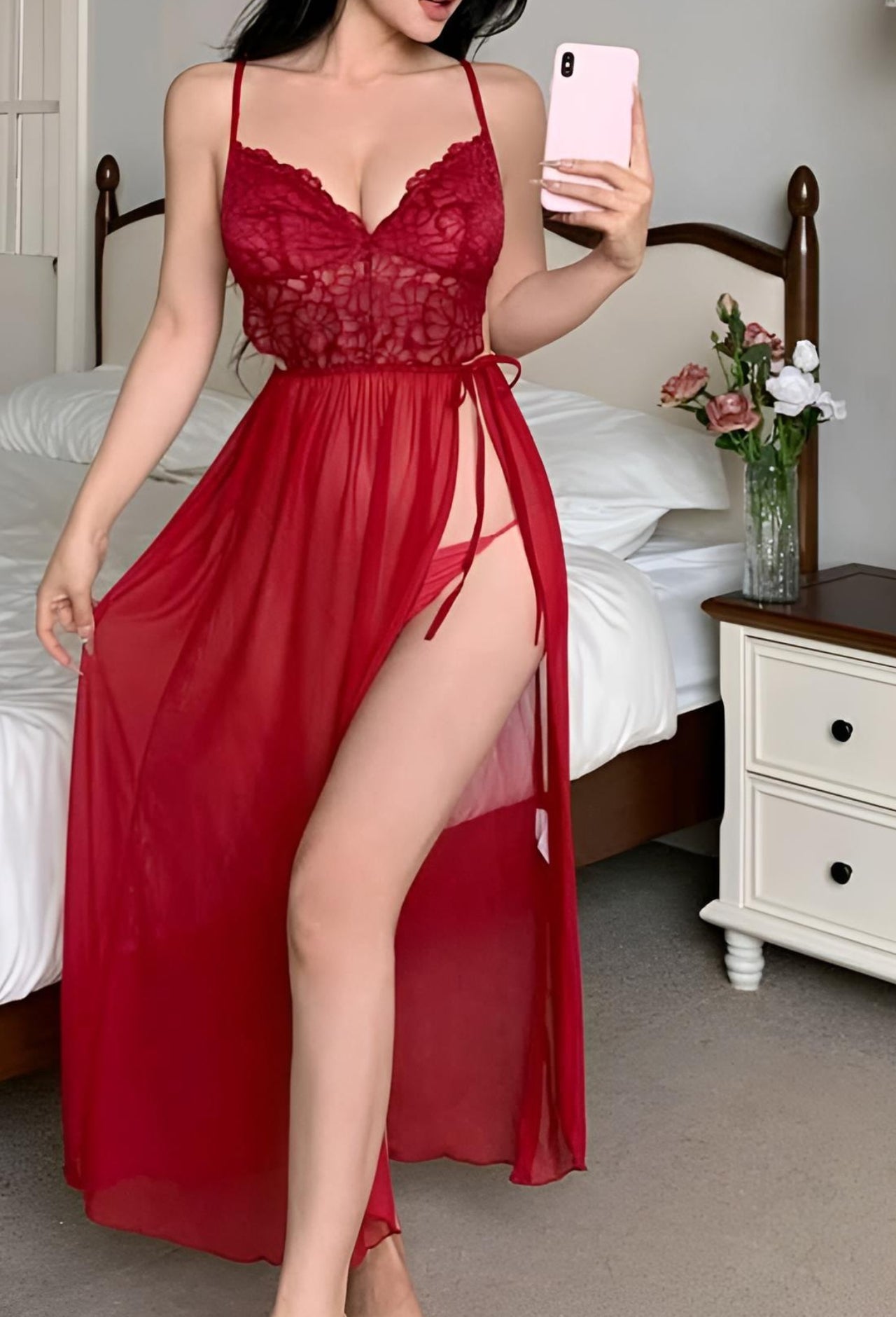 The delicately embroidered lace bodice gently contours the body, offering breathable comfort and refined feminine detail. The sheer tulle skirt flows gracefully to the floor, featuring a flattering high slit with an adjustable side tie for added allure and movement. Lightweight and soft against the skin, this piece delivers both sensuality and comfort in perfect harmony.