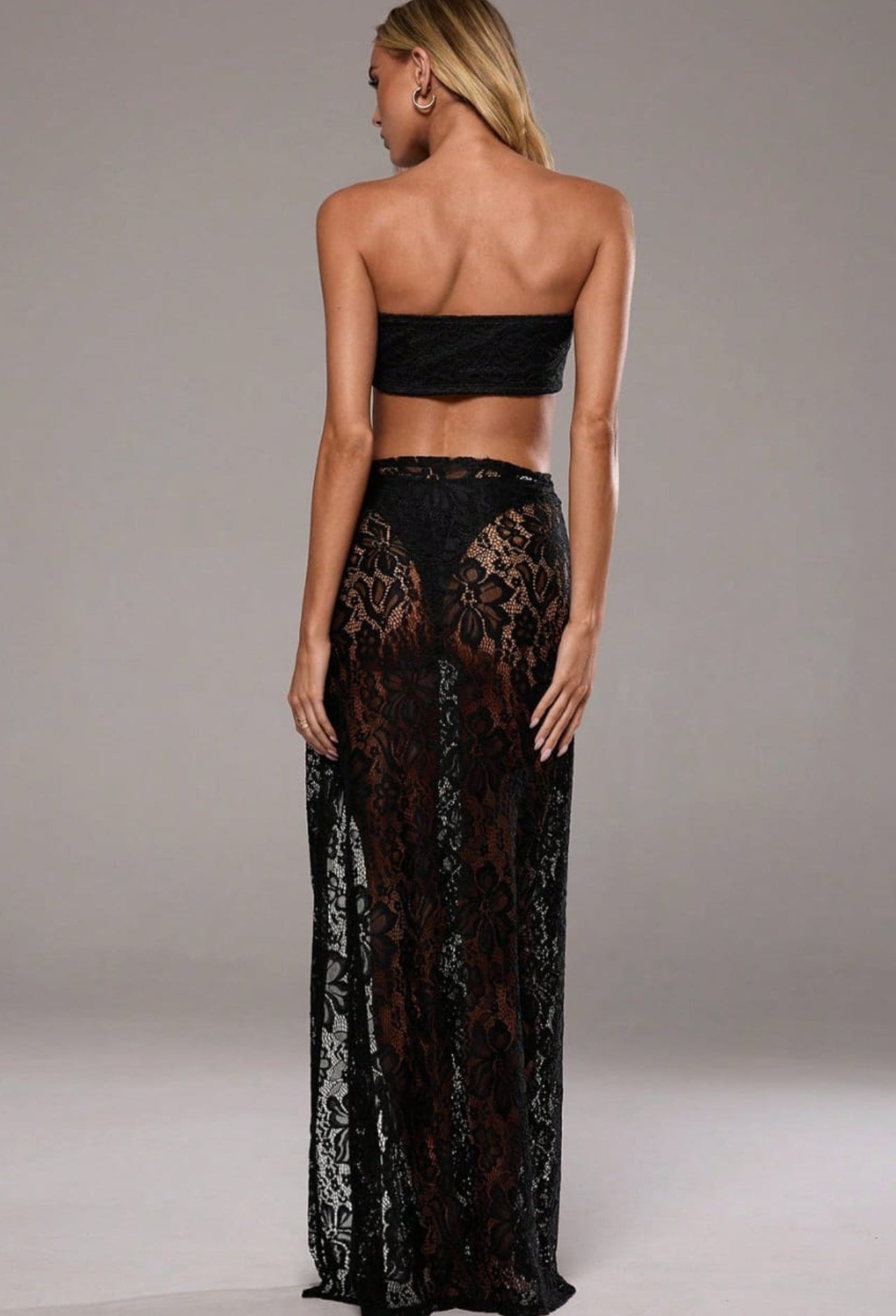 The set features a strapless bandeau-style top that beautifully frames the shoulders and neckline, offering a sleek and modern silhouette. It pairs perfectly with a high-waisted lace skirt that flows effortlessly, designed with a front tie detail and a subtle slit that adds movement and allure with every step.